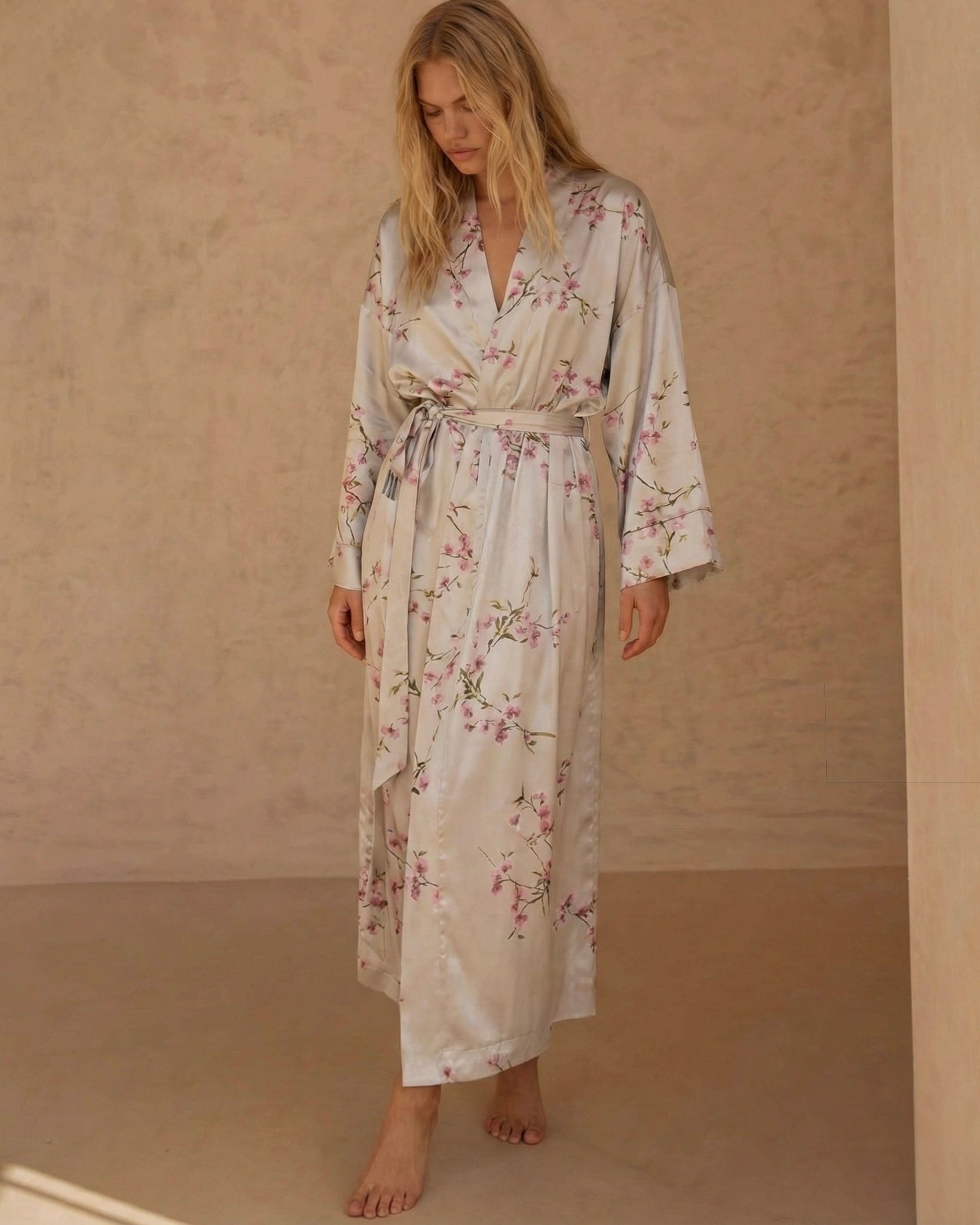 Blossom Satin Kimono — a lightweight, fluid piece designed to elevate your summer rituals. Crafted from natural viscose and enhanced with a touch of polyester for lasting wear, this kimono drapes beautifully on the body while remaining breathable and soft to the touch.