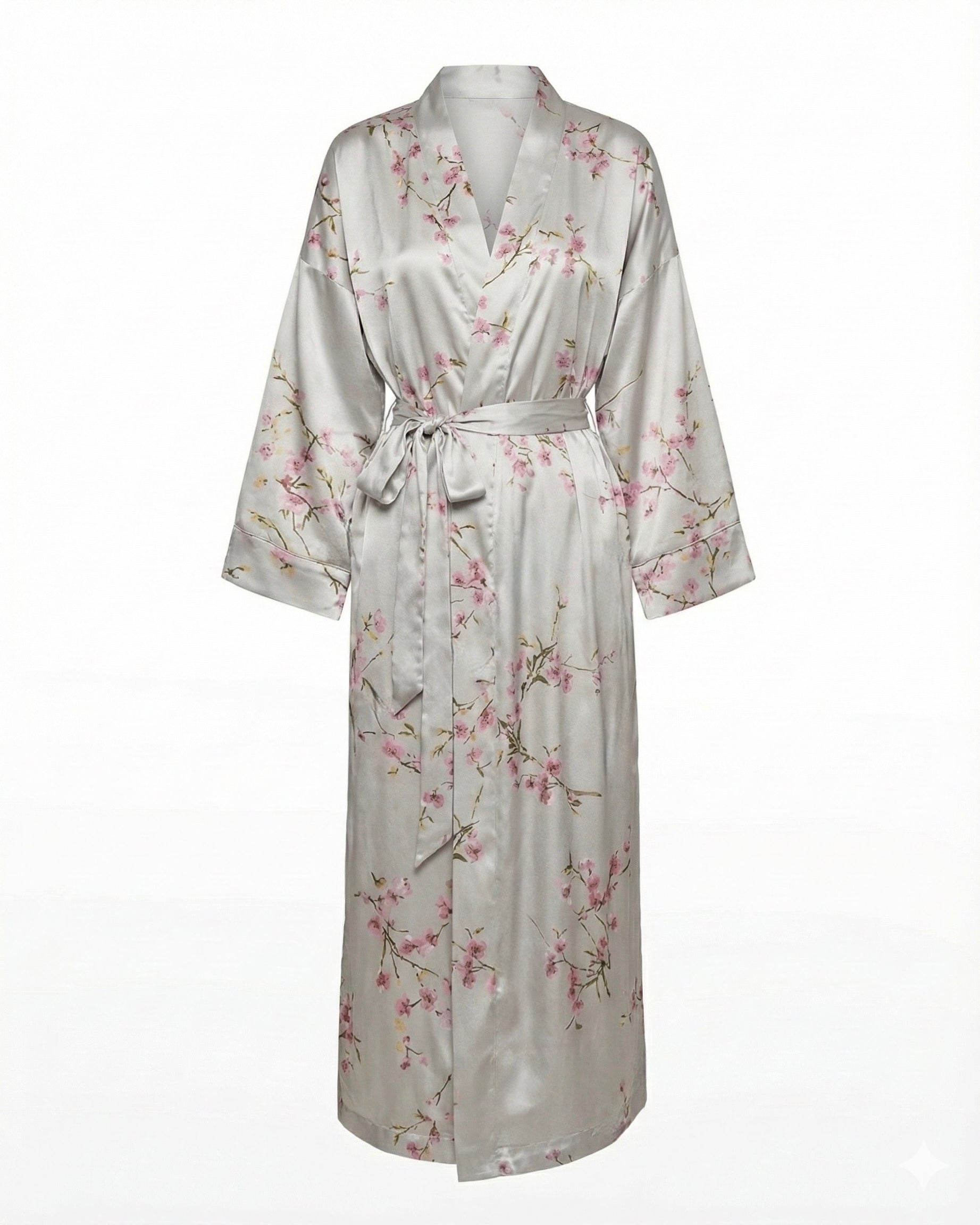 The delicate floral print in soft pink tones adds a romantic whisper to the luxurious satin texture, while the adjustable waist tie flatters your silhouette with minimal effort. Whether worn over a swimsuit poolside or layered for a chic resort look, this kimono is your go-to for feminine ease and timeless grace.