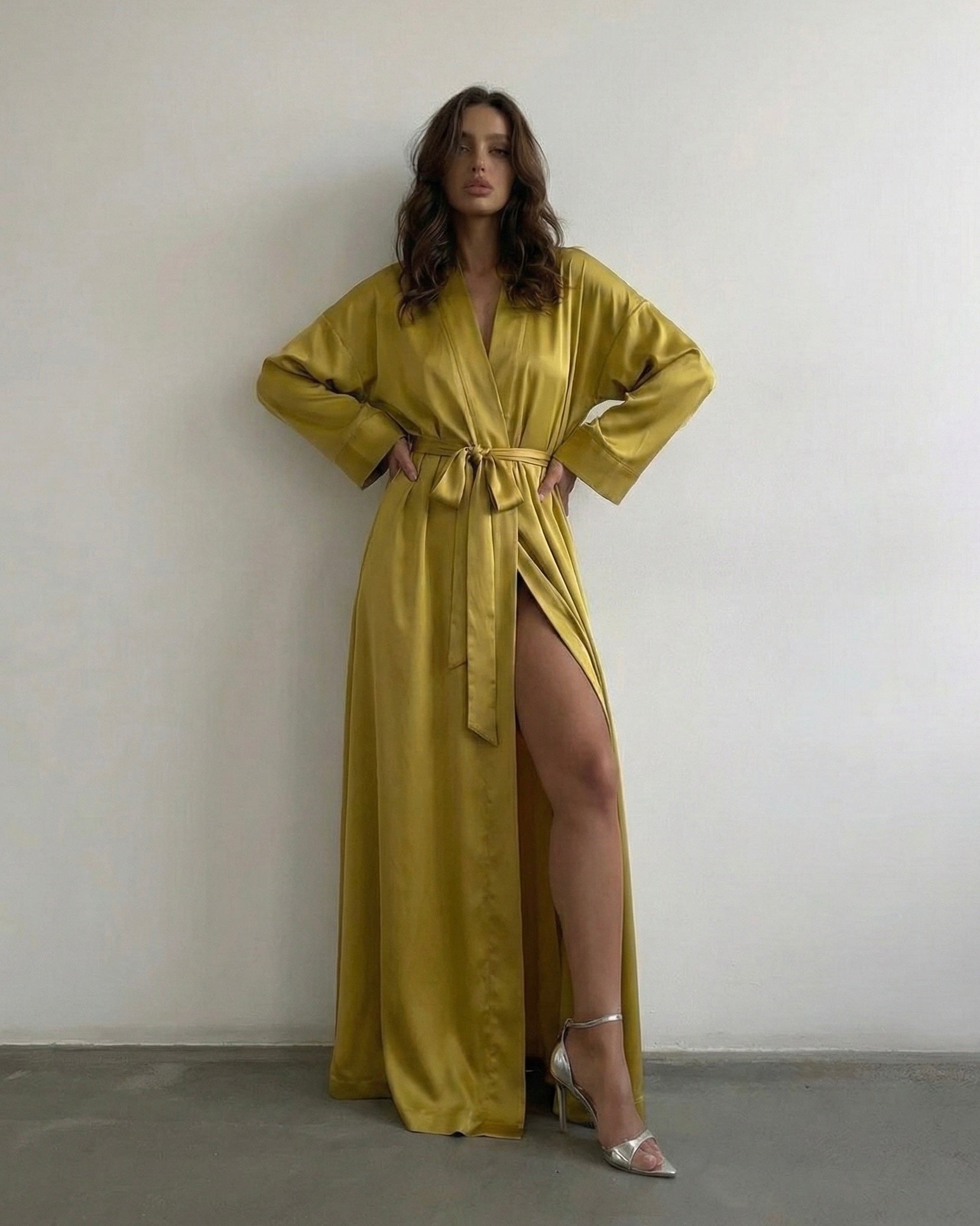 The Sapphire kimono is an ode to simplicity that whispers luxury. Crafted from high-quality viscose satin, it catches the light with every movement — smooth, soft, and impossibly elegant. With its clean silhouette, flowing drape, and detachable belt, Sapphire can be worn both as loungewear and as a statement layering piece.