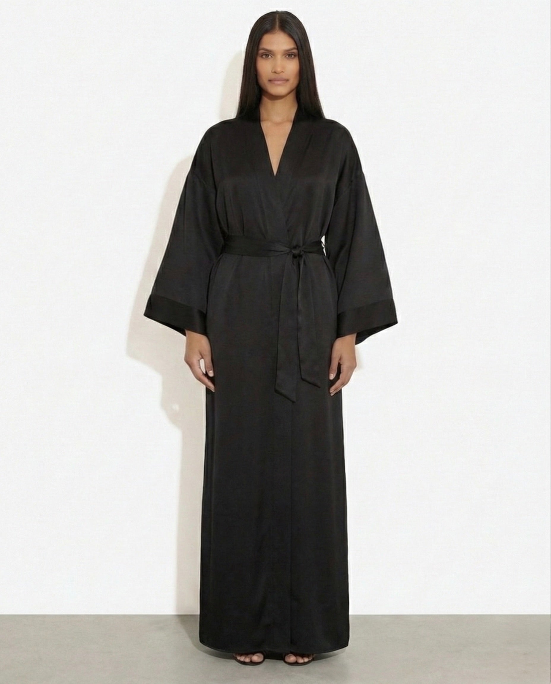 The Sapphire kimono is an ode to simplicity that whispers luxury. Crafted from high-quality viscose satin, it catches the light with every movement — smooth, soft, and impossibly elegant. With its clean silhouette, flowing drape, and detachable belt, Sapphire can be worn both as loungewear and as a statement layering piece.