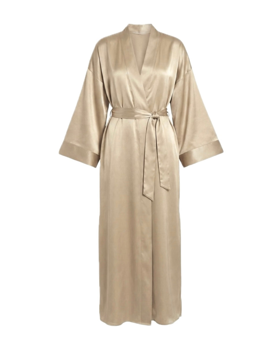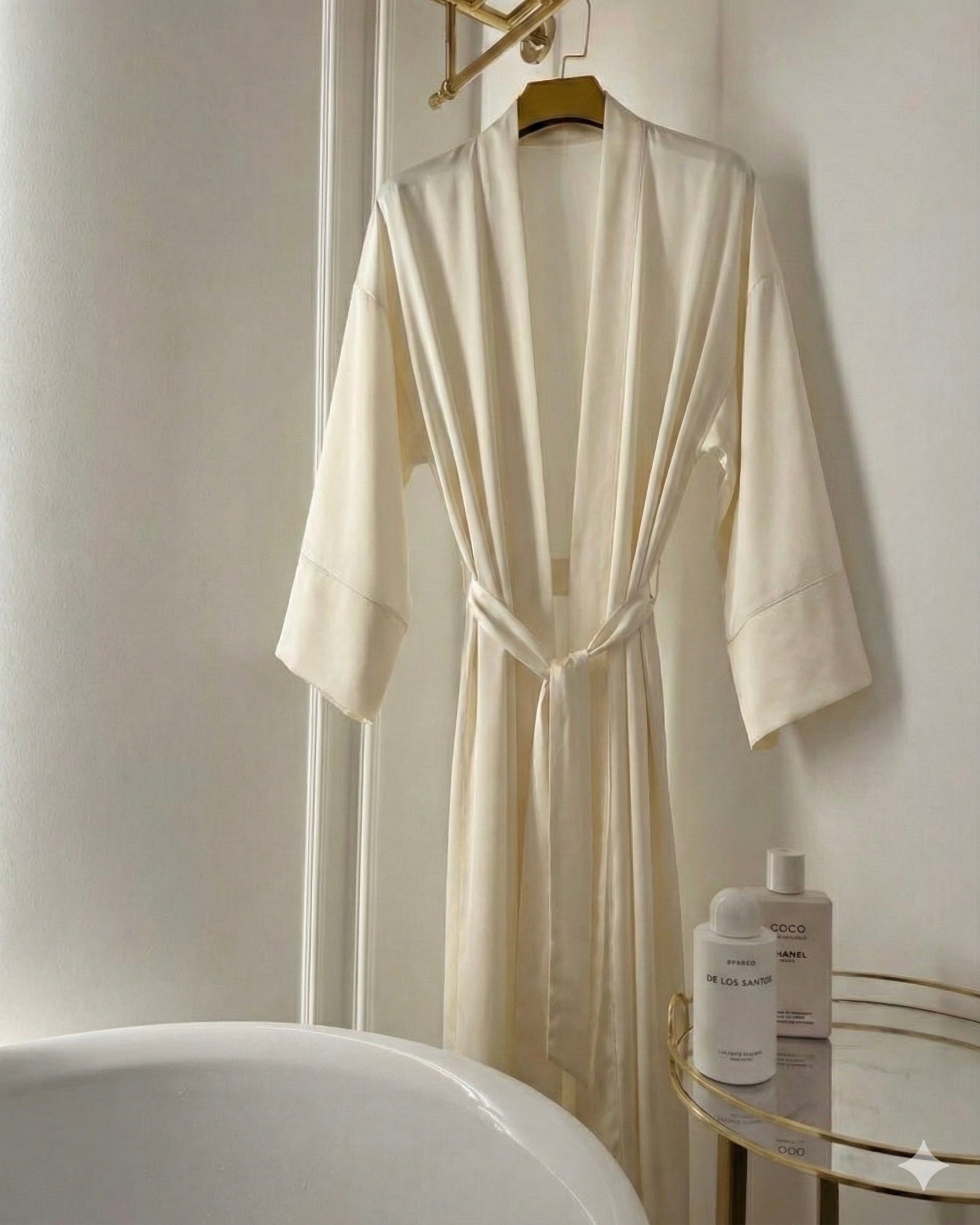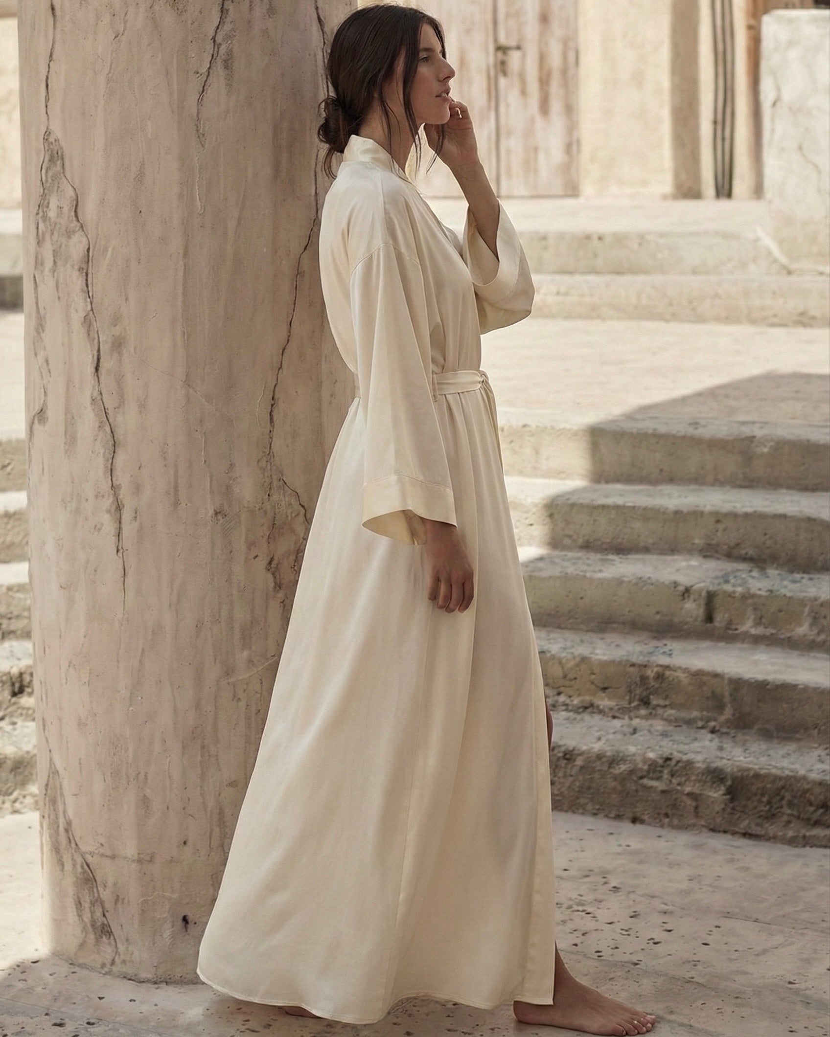 The Sapphire kimono is an ode to simplicity that whispers luxury. Crafted from high-quality viscose satin, it catches the light with every movement — smooth, soft, and impossibly elegant. With its clean silhouette, flowing drape, and detachable belt, Sapphire can be worn both as loungewear and as a statement layering piece.