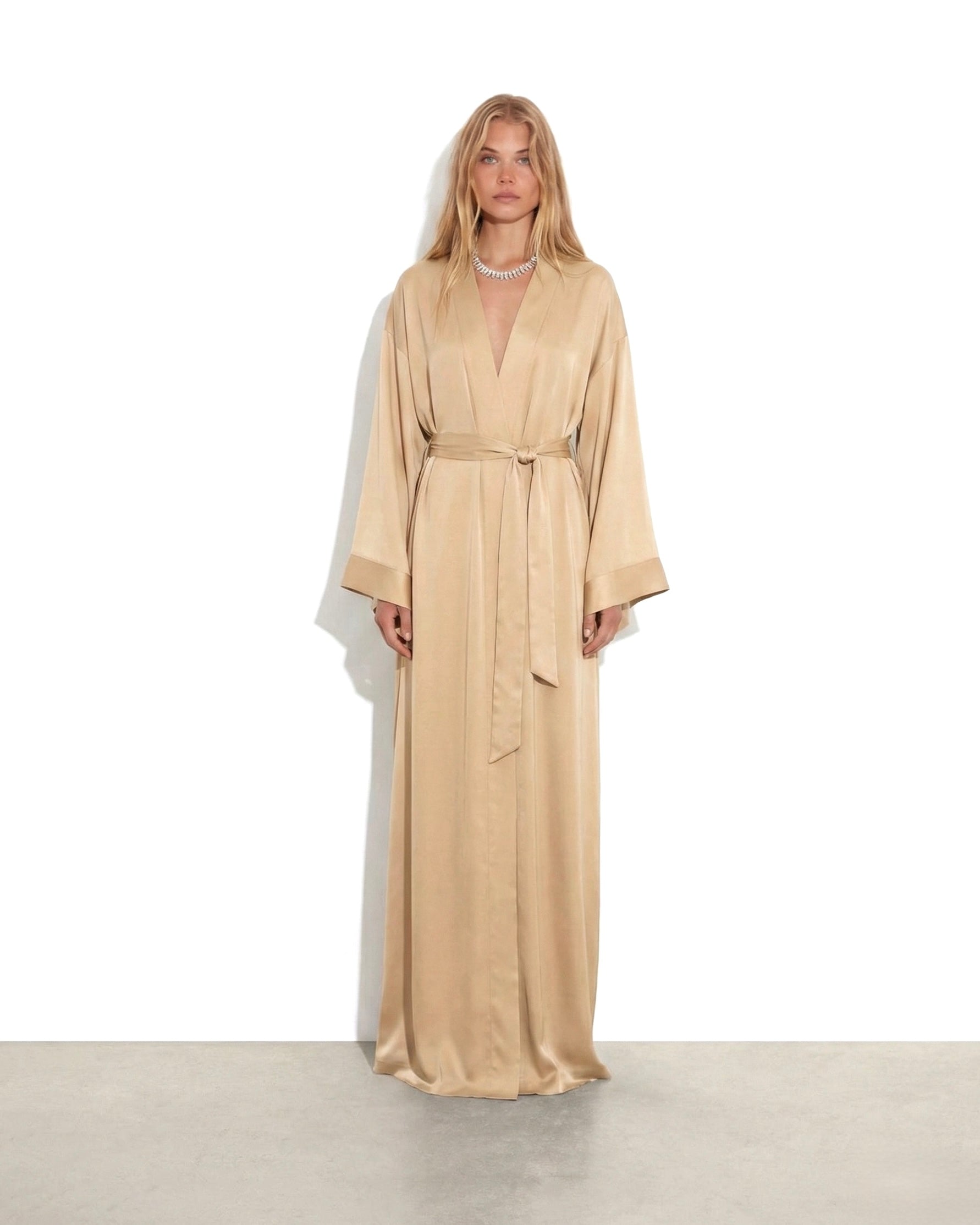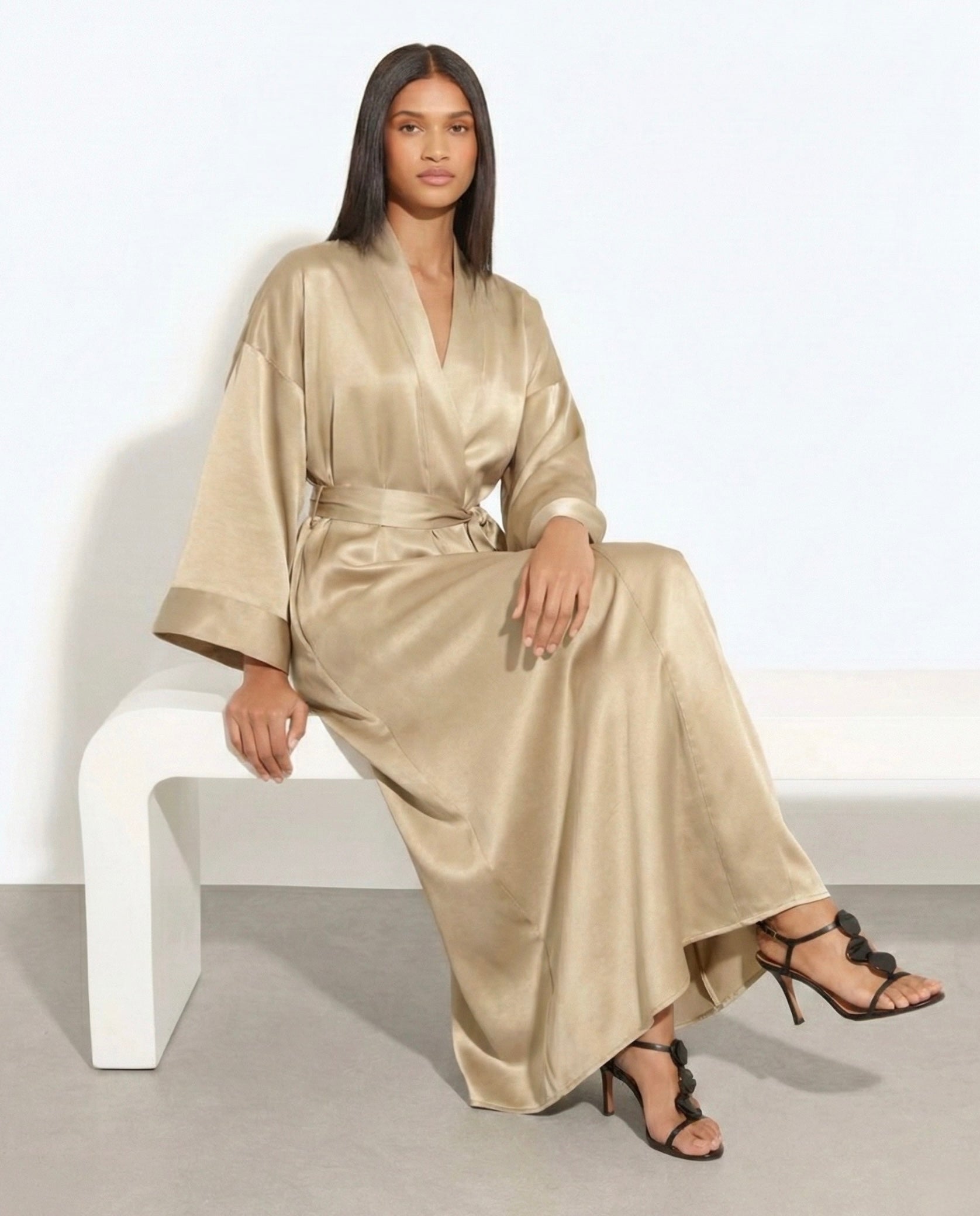 The Sapphire kimono is an ode to simplicity that whispers luxury. Crafted from high-quality viscose satin, it catches the light with every movement — smooth, soft, and impossibly elegant. With its clean silhouette, flowing drape, and detachable belt, Sapphire can be worn both as loungewear and as a statement layering piece.