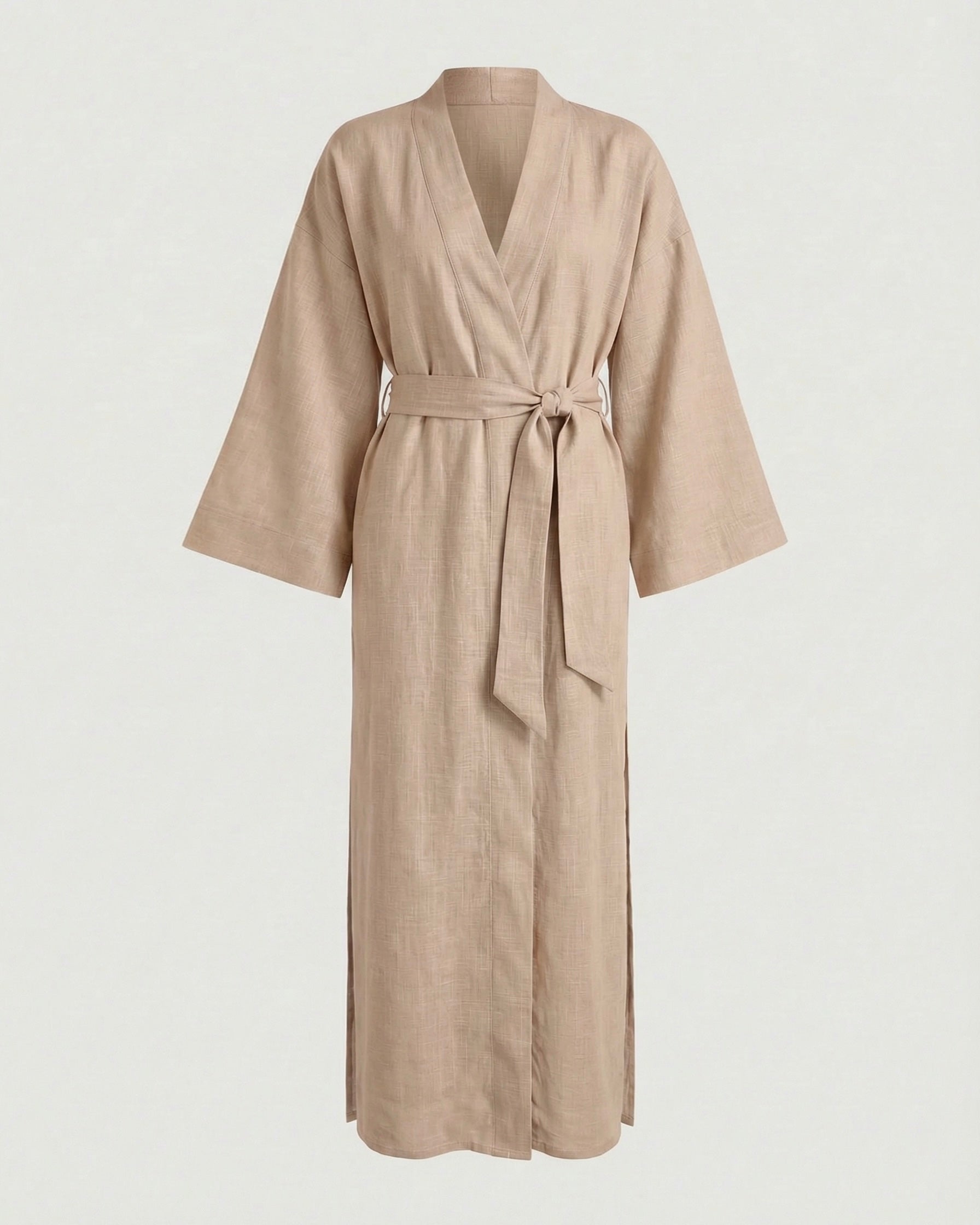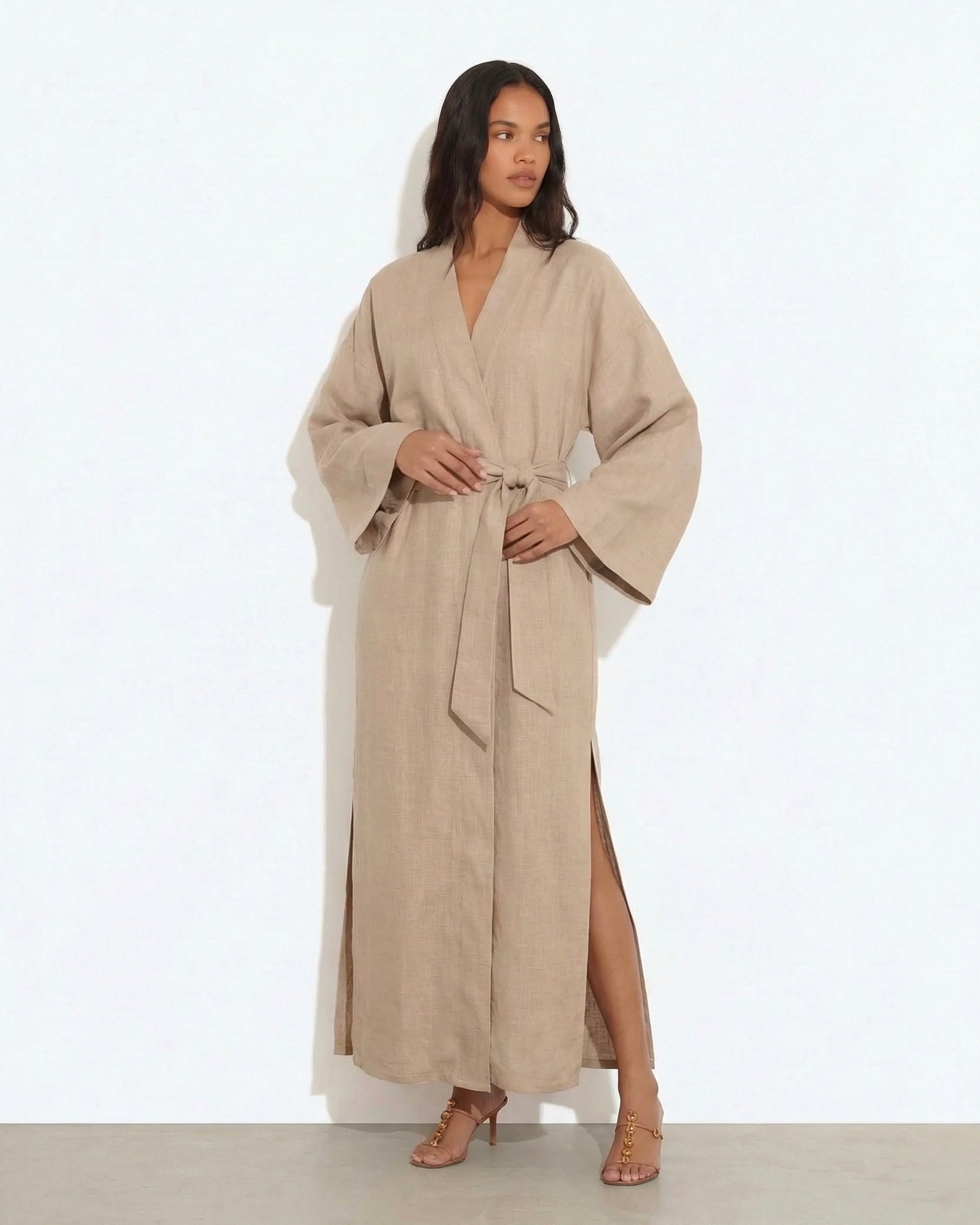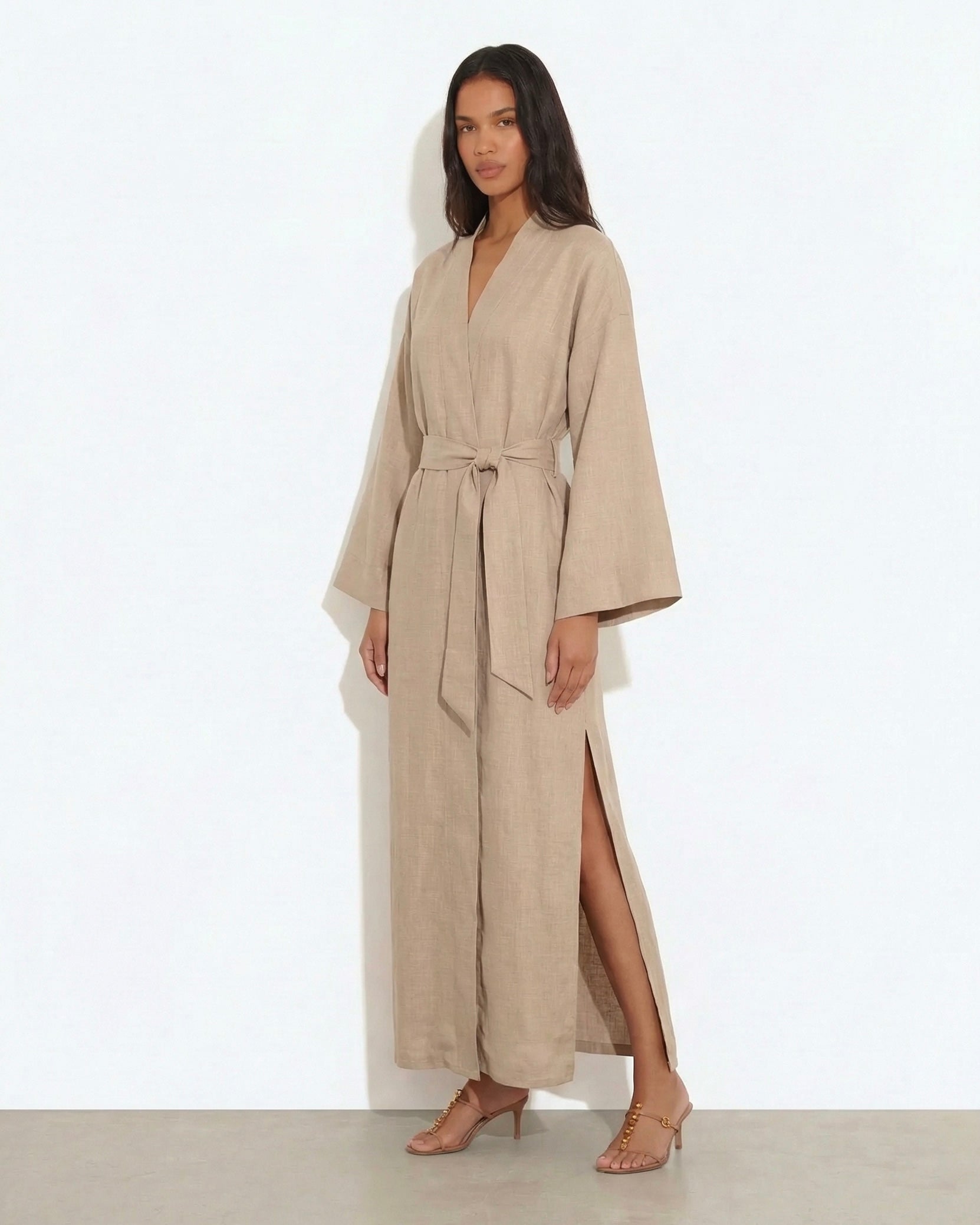 The Soul kimono dress is a quiet expression of natural elegance. Crafted from a breathable blend of organic linen and cotton, it feels light against the skin while holding a beautifully structured silhouette. Effortless, yet defined.