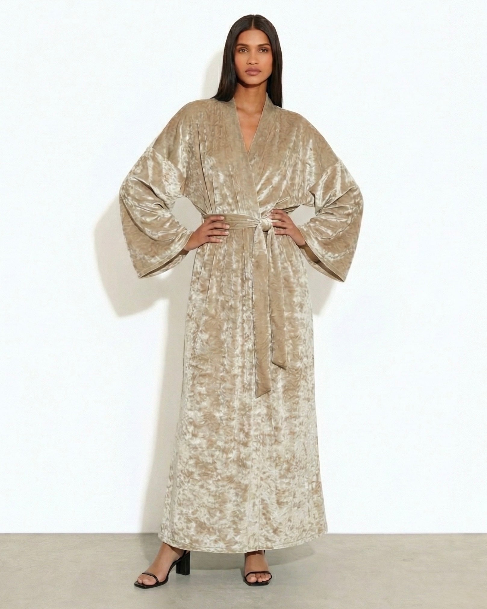 The Velvet Marble kimono reimagines luxury through texture. Crafted from soft velvet with a distinctive marble-effect finish, it captures the beauty of natural stone and creates a soft shimmer that shifts with every step.