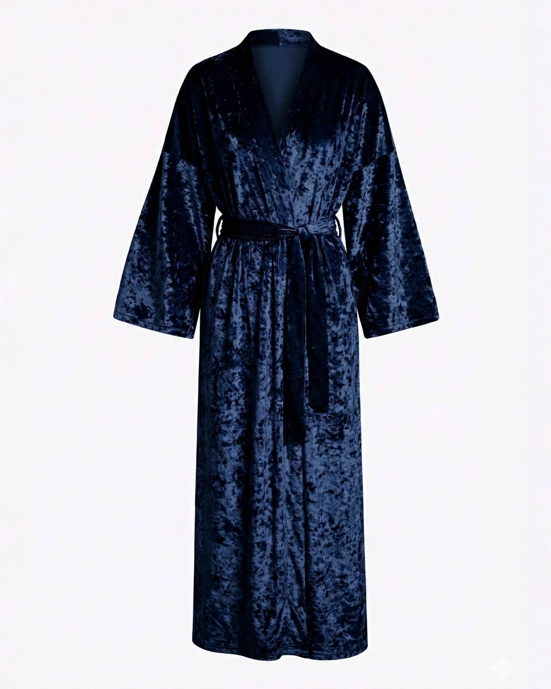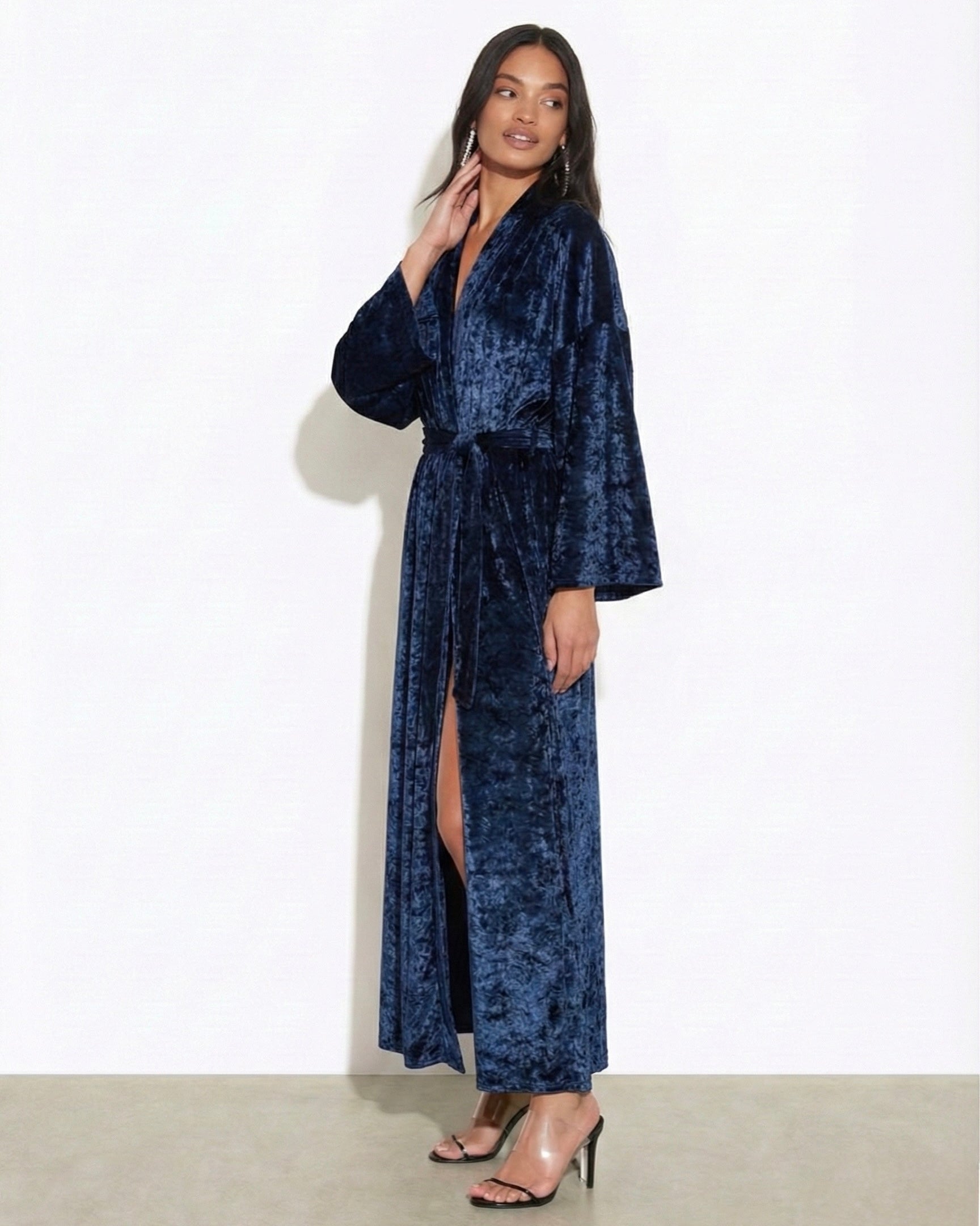 The Velvet Marble kimono reimagines luxury through texture. Crafted from soft velvet with a distinctive marble-effect finish, it captures the beauty of natural stone and creates a soft shimmer that shifts with every step.
